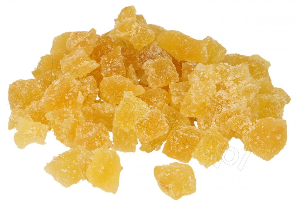Duże kawałki rozpływającego się w ustach kandyzowanego imbiru. Doskonale nadaje się jako dodatek do herbaty, jak również do przetworów i wypieków.